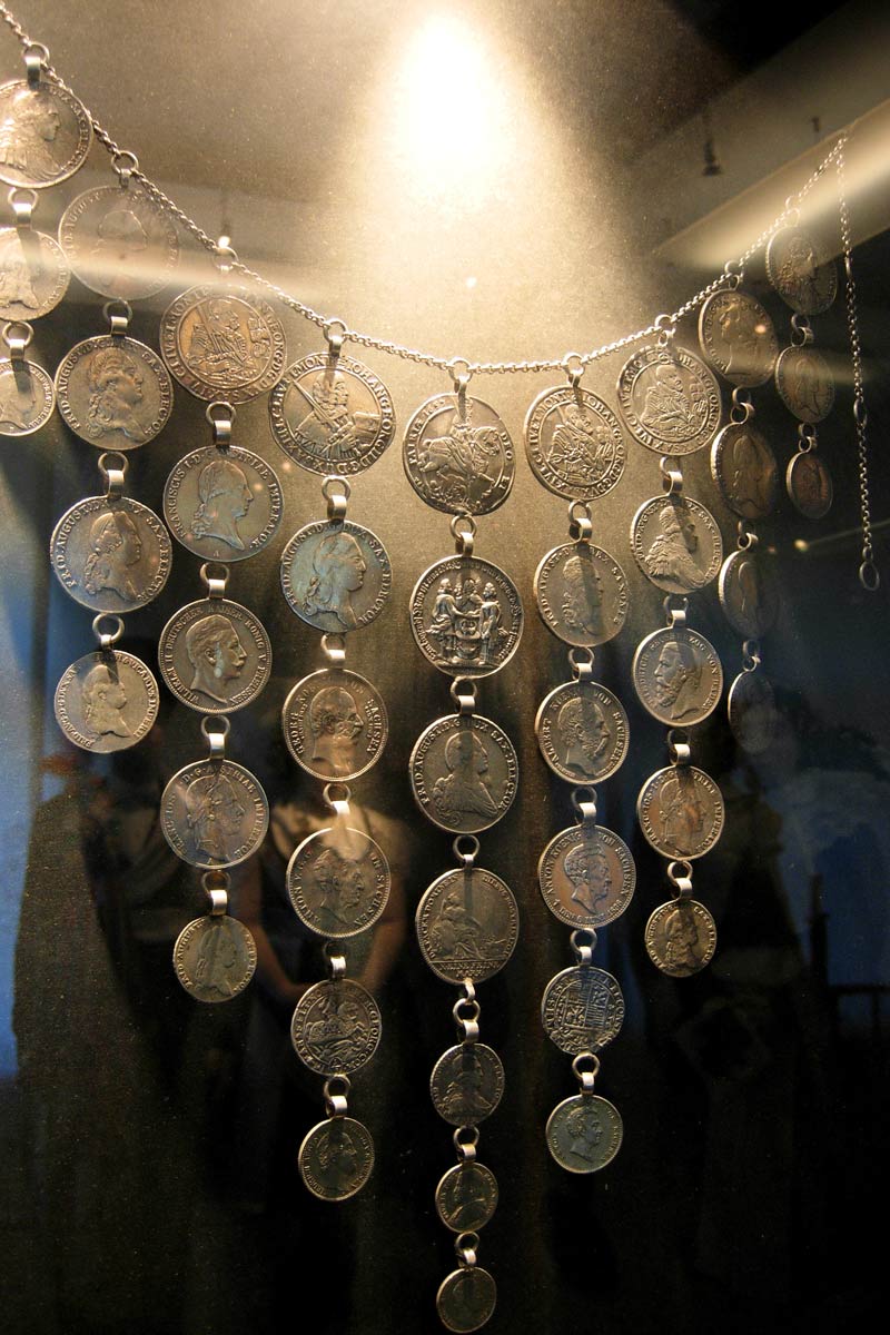 Die geschickten einheimischen Goldschmiede können solche Münzschnüre noch immer kunstvoll fertigen oder auch reparieren. Heute kann man in solchen Schnüren die Silbermünzen aus dem Kaiserreich, neben denen der DDR und den modernsten Euromünzen finden. Eine solche Münzschnur hat zwar im unterem Bereich Münzen aus dem Eurozeitalter, sie stammt aber trotzdem von der Urgroßmutter ab, denn ganz oben beginnt die Kette mit einem 20-Mark-Stück von 1905 aus Gold.
